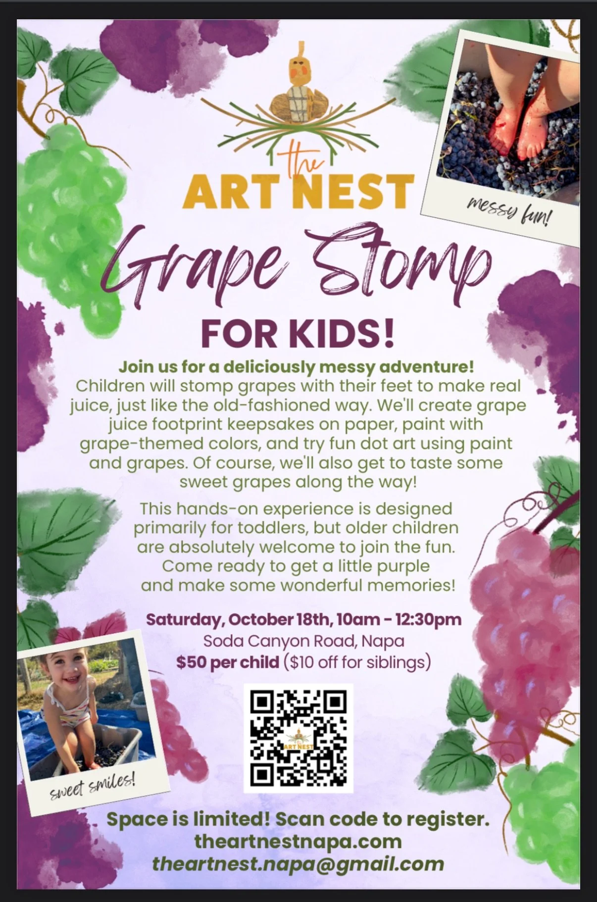 Ticket includes: immersive vineyard walk guided by the grapegrower, followed by a good old-fashioned grape stomp!