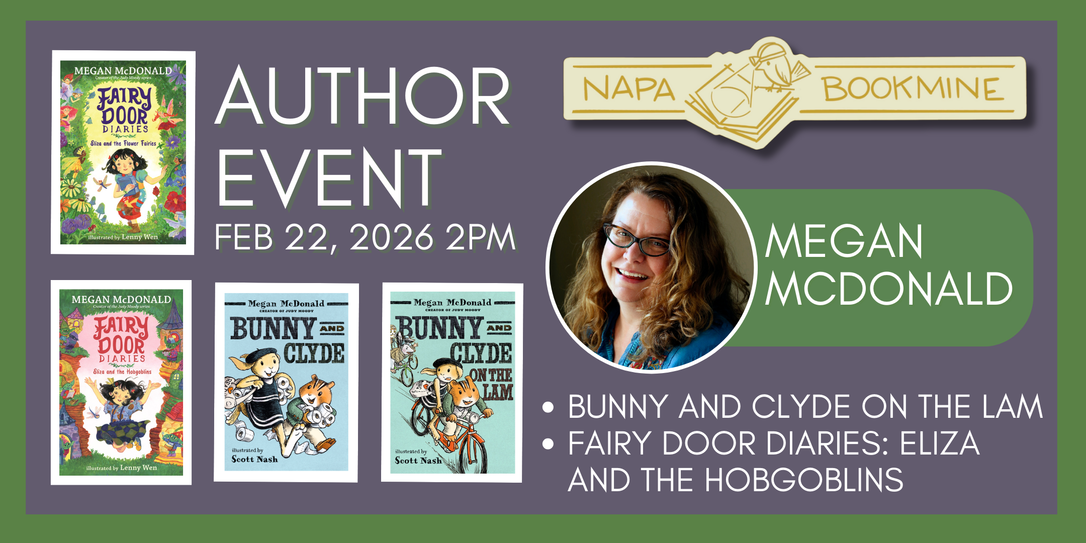 Author Event with Megan McDonald - CANCELLED!!(All Ages) Sunday, February 22, 2026 2:00 PM 3:00 PM Napa Bookmine 1625 2nd Street Napa, CA, 94559 United States (map) Google Calendar ICS Author Event with Megan McDonald!!Join us for a special event with Megan McDonald, author of Bunny and Clyde On the Lam, and Fairy Door Diaries: Eliza and the Hobgoblins. This event is free, but we appreciate your RSVP below so we can plan for your attendance. Learn more