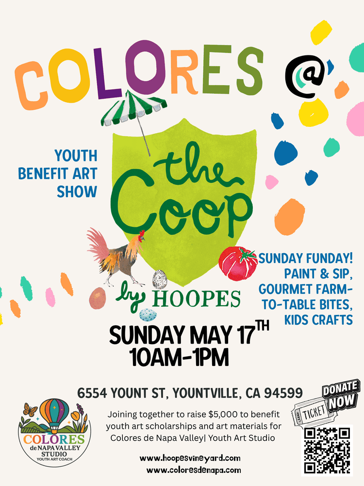 Colores de Napa Valley Youth Benefit Art Show & Fundraiser (All Ages) Sunday, May 17, 2026 10:00 AM 1:00 PM The Coop by Hoopes 6554 Yount Street Yountville, CA, 94599 United States (map) Google Calendar ICS Colores de Napa Valley Youth Benefit Art Show & Fundraiser Learn more Learn more