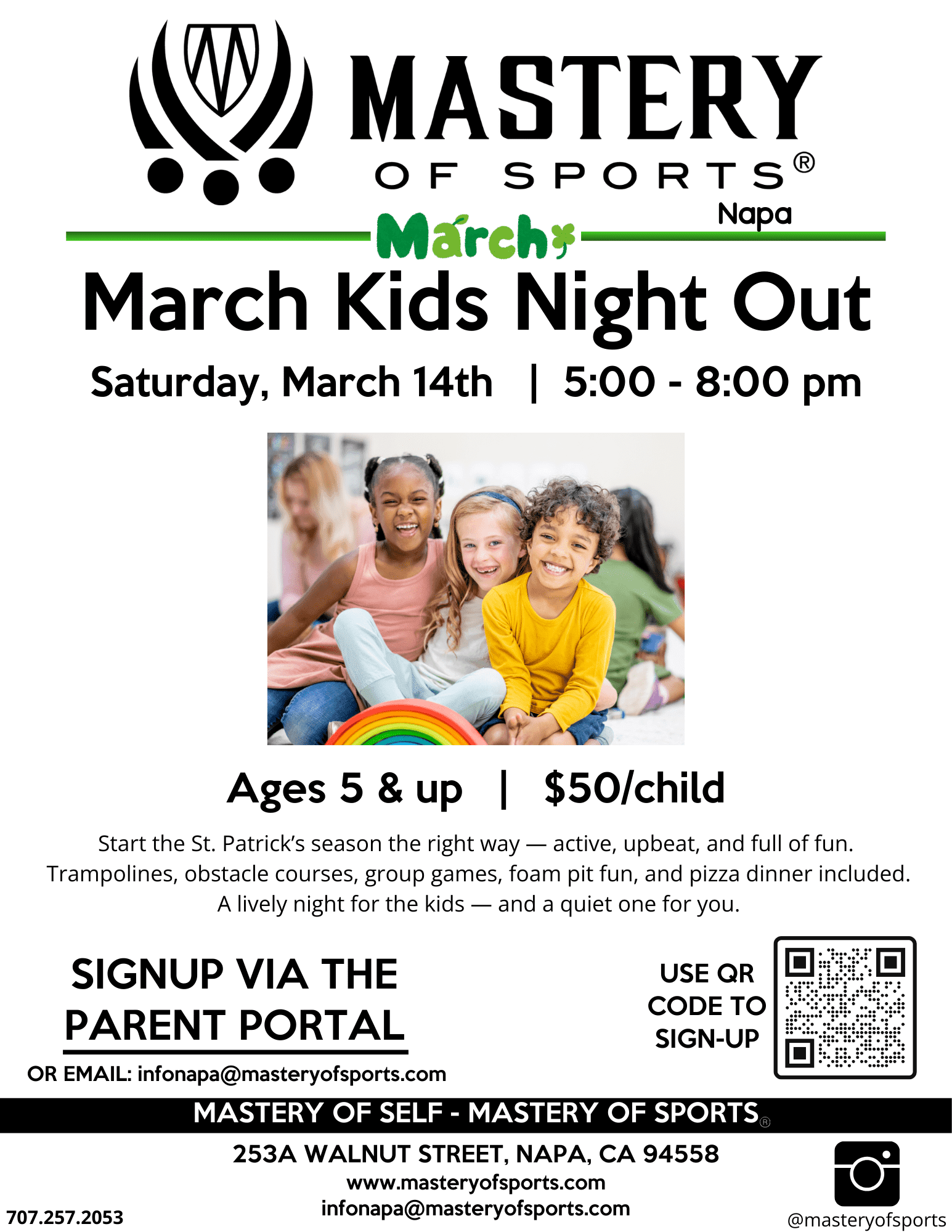 Back to All Events Mastery of Sports March Kids Night Out (Age 5+) Saturday, March 14, 2026 5:00 PM 8:00 PM Mastery of Sports - Napa 253 Walnut Street Napa, CA, 94559 United States (map) Google Calendar ICS Learn more