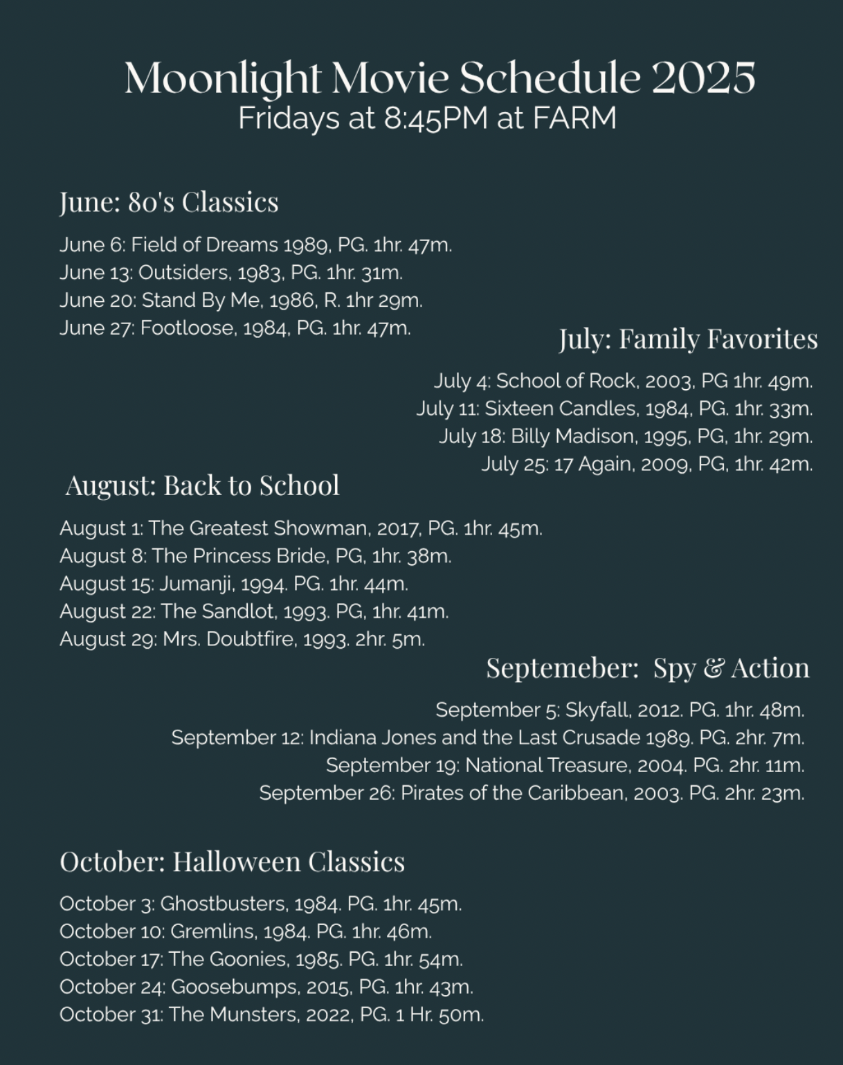 Meet us under the stars for an enchanting outdoor movie at sunset every Friday night.